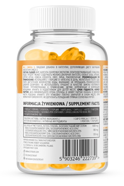 OstroVit Omega 3 - это полезная биологически активная добавка на основе рыбьего жира. Содержит омега-3 жирные кислоты, которые поддерживают работу сердца и мозга, а также укрепляют кровеносные сосуды. EPA и DHA положительно влияют на психические функции, улучшают процессы памяти, фокус и концентрацию. Омега-3 жирные кислоты необходимы для поддержания оптимального самочувствия и здоровья. Они найдены в слоях жирной холодноводной рыбы и ракообразных, растительных масел и орехов. Они обеспечивают ценную эйкозапентаеновую кислоту (EPA) и докозагексаеновую кислоту (DHA), которые чаще всего поддерживаются для поддержания нормальной работы сердца.