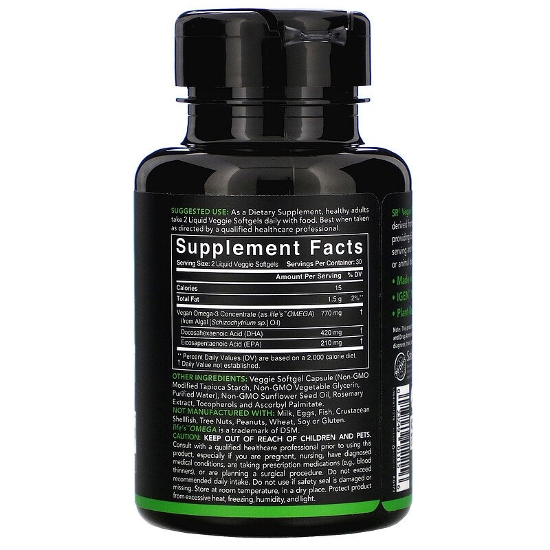 Веганские омега-3 от SR производятся исключительно из растительного масла водорослей, содержат 630 мг ДГК и ЭПК на порцию и не содержат рыбьего жира или ингредиентов животного происхождения.