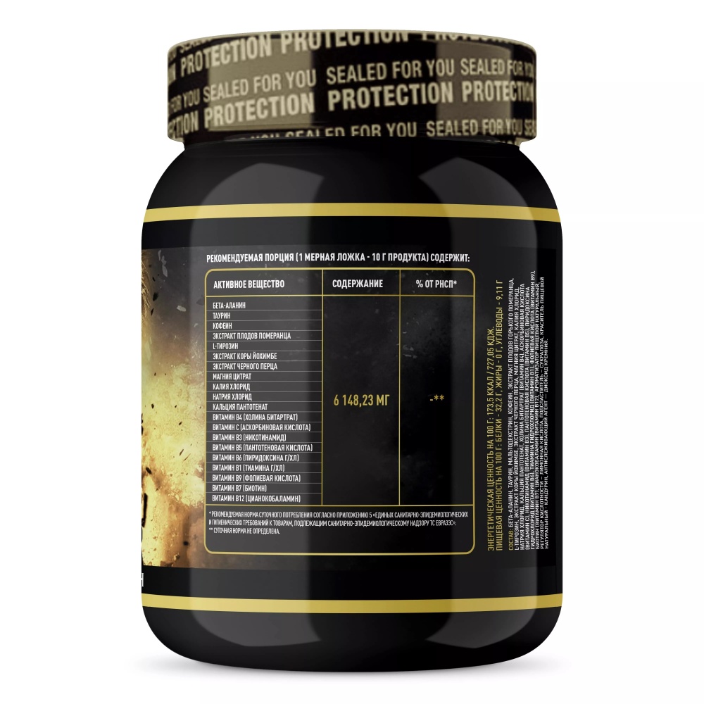 Состав: бета-аланин, таурин, мальтодекстрин, кофеин, экстракт плодов горького померанца. L-Тирозин, экстракт коры йохимбе, экстракт черного перца, матния цитрат, калия хлорид, натрия хлорид, кальция пантотенат, холина битартрат (витамин в4), аскорбиновая кислота (витамин с), никотинамид (витамин вз), пантотеновая кислота (витамин в5), пиридоксина гидрохлорид (витамин в6), тиамина гидрохлорид (витамин в1), фолиевая кислота (витамин в9), биотин (витамин в7), цианокобаламин (витамин в12), ароматизатор пищевой натуральный, регулятор кислотности - лимонная кислота. подсластитель - сукралоза, краситель пищевой натуральный - кандурин, антислеживающий агент - диоксид кремния.