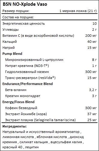Что отличает NO-Xplode Vaso от BSN от многих предтренировочных комплексов? Он создает условия для невероятно ощутимого мышечного пампинга. Обеспечивают такой эффект цитруллин и креатин нитрат NO3-T. Формула усилена гидролизованным казеином, селягинеллой и ресвератролом, которые улучшают накачку мышц. Благодаря бета-аланину в составе комплекса вы сможете повысить общую выносливость своего организма. Присутствует в основе комплекса и кофеин, который стимулирует мозговую деятельность и тем самым помогает длительное время сохранять высокую концентрацию внимания.
