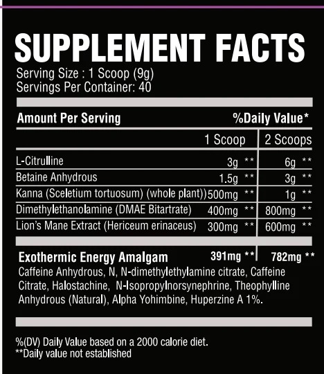 Канна (Sceletium tortuosum): этот ингредиент действительно делает Формулу уникальной и дает дополнительный эффект, которого вы не получите от других предтренов. Это полностью натуральная трава, которая действует как ноотроп и взаимодействует с 77 различными рецепторами. Было показано, что она действует как естественный селективный ингибитор обратного захвата серотонина (SSRi), который может увеличивать серотонин и блокировать его поглощение. Это может положительно повлиять на ваше настроение, приведя вас в чрезвычайно сосредоточенное и эйфорическое настроение. Канна также действует как высвобождающий моноамин агент, повышая уровень дофамина и адреналина. Еще одним преимуществом Канны является ее способность действовать как ингибитор фосфодиэстеразы 4 (PDE4i), где PDE4 регулирует настроение, формирование долговременной памяти и бодрствование. Исследуемая доза составляет 25 мг, однако мы использовали 1000 мг экстракта 2:1 для того, чтобы максимизировать его эффекты и точно имитировать то, как он используется в пищевой промышленности.