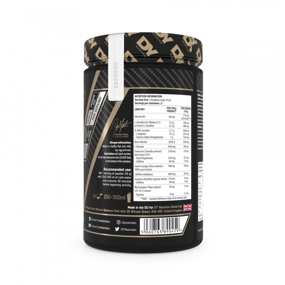 Состав: L-грулин DL-малат (2-1), бета-аланин, комплекс A.-AKG (L-аргинин, альфа-кетогулартат кальция), антислеживатели (диоксид кремния, соли кальция ортофосфорной кислоты), ароматизаторы, L-тирозин. (форма свободной аминокислоты), мальтодекстрин, кофеин безводный, экстракт листьев зеленого чая (Camellia sinensis) (стандартизированный до 95% полифенолов и 5% кофеина), подсластители (сукралоза, ацесульфам-К), сладкий апельсин (Citrus sinensis) 100% кожура экстракт, никотинамид, экстракт семян гуараны (стандартизированный до 22% кофеина), экстракт плодов черного перца (Piper nigrum)