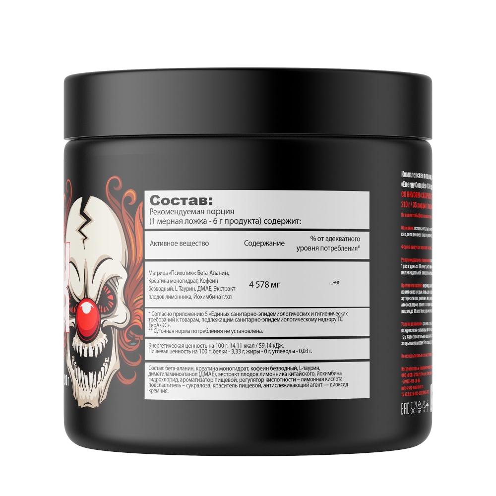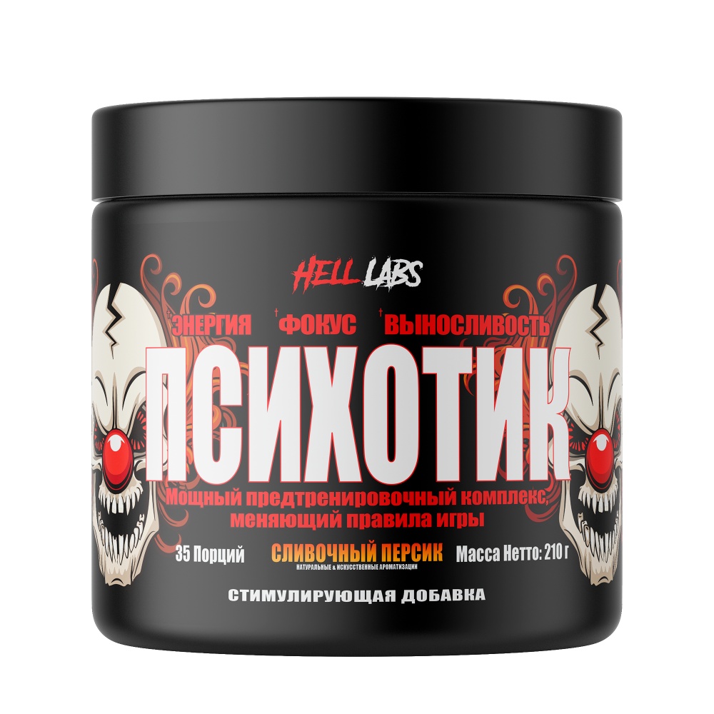 Предтренировочный комплекс Psychotic - даёт мощный выброс энергии, фокусировки и эйфории в течении 3 часов.