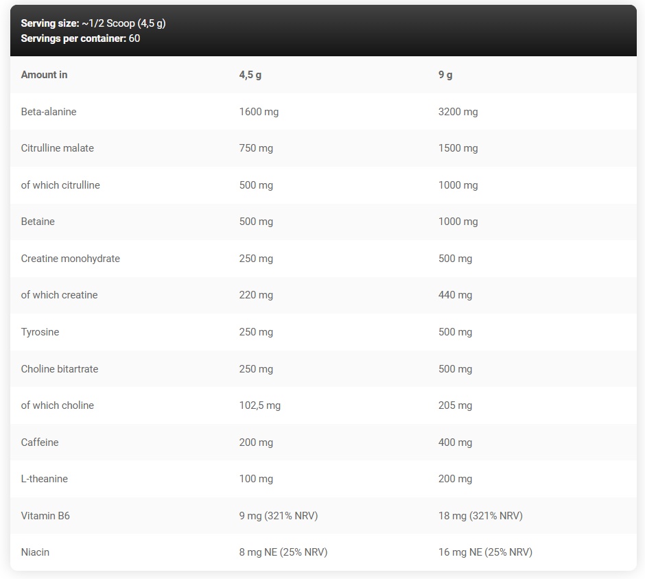 Рекомендации по применению: Смешайте 1/2 мерной ложки порошка (4,5 г) со 100-150 мл воды. Пейте по 1 порции утром и по 1 порции за 30-45 минут до тренировки.