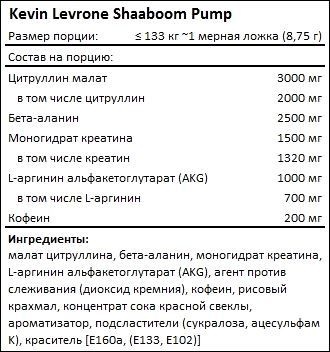 Формула комплекса Shaaboom Pump от Kevin Levrone включает бета-аланин, аргинин альфа-кетоглютарат, цитруллин малат, кофеин, креатиновую смесь. Каждое из соединений вносит вклад в повышение производительности организма в условиях физических нагрузок.