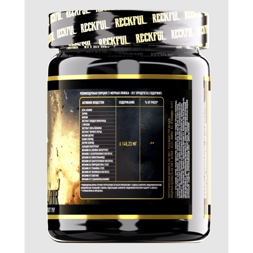 Воздействие RECKFUL Gold на уровень работоспособности достаточно сильное, поэтому активность данного предтренировочного комплекса длительная, что позволяет держать энергию, драйв, выносливость, концентрацию внимания и мотивацию на весьма высоком уровне всю тренировку.
