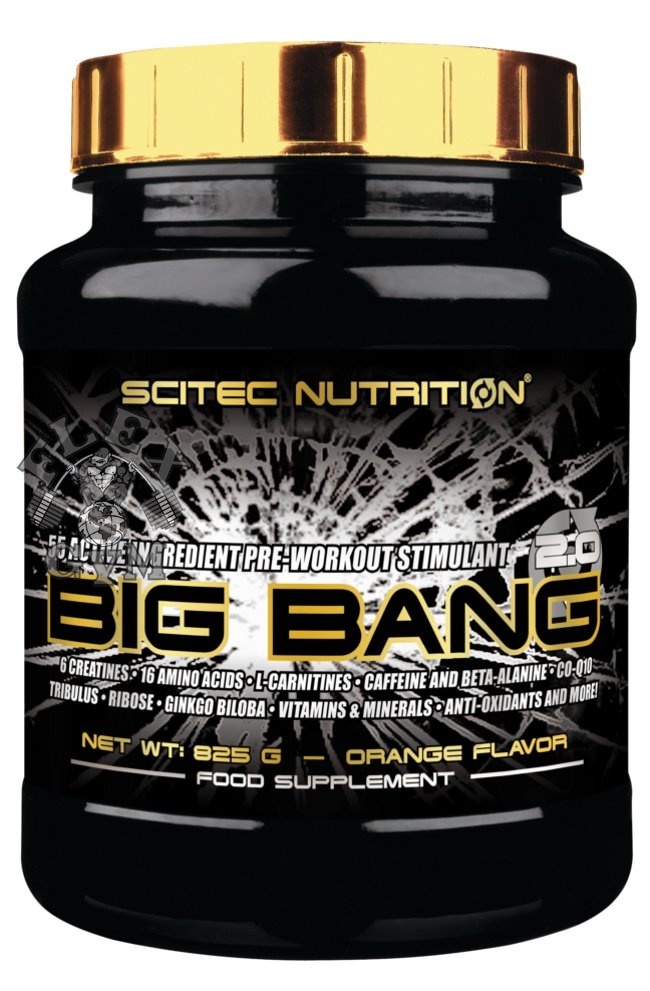Big Bang 2.0 - новая формула от Scitec Nutrition для приема перед тренировкой. В ней содержится более 50 активных компонентов. Содержит карнитиновую матрицу и стимуляторы оксида азота, также глютаминовую смесь G-Bomb и необходимые аминокислоты (в т.ч. ВСАА). Он увеличивает работоспособность за счет матрицы задержки усталости. Благодаря экстракту Tribulus Terrestris увеличивается уровень тестостерона, зеленый чай и кофеин - это природные энергетики. L-карнитин в составе Big Bang 2.0 обеспечивает эффект жиросжигания при этом выделяется большое количество энергии, которая необходима на любой тренировке. Окись азота расширяет кровеносные сосуды, что позволяет клеткам быстрее получать питательные вещества и кислород.