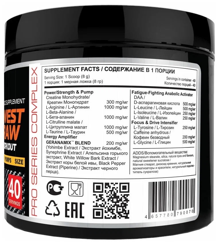 Одной из уникальных составляющих для предтренировочных комплексов, которую мы используем, это наличие в составе нашего продукта трех незаменимых аминокислот BCAA, что позволяет вам избежать катаболизма и тренироваться тяжело и с полной отдачей!