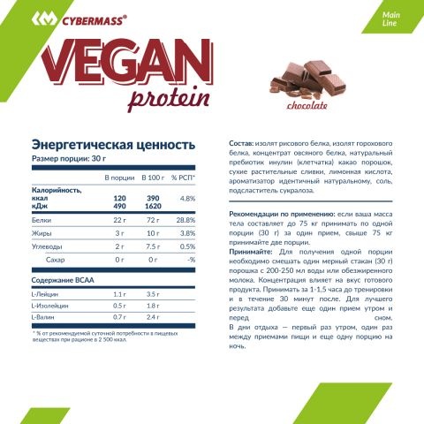 Продукт разработан для веганов и вегетарианцев с уникально подобранной матрицей растительных белков и обогащен натуральным пребиотиком инулин. В состав данного продукта входит: Овсяный белок — имеет высокий уровень содержания аминокислот с разветвленной цепью (ВСАА). Углеводную часть белка овса представляет мальтодекстрин, быстроусвояемый растительный углевод с высоким гликемическим индексом (105), не относится к сахарам. Входящая в состав белка клетчатка представлена бета-глюканом, это растворимые волокна, стимулирующие пищеварение и выведение шлаков. Помимо клетчатки и мальтодекстрина в углеводной части белок овса отличается сбалансированным соотношением протеинов, жиров и углеводов, а также синергичным витаминно-минеральным составом (витамины А, Е, К, группа В, кальций, калий, магний, железо и фосфор). Гороховый белок — в состав белка входят все заменимые и незаменимые аминокислоты, по содержанию BCAA соответствует казеиновому и сывороточному протеину. Польза горохового протеина заключается в полноценном аминокислотном профиле (22 аминокислоты) и отсутствии антинутриентов, он содержит минимальное количество жиров и клетчатки, что обеспечивает уровень усвоения 98%. Этот растительный протеин популярен среди спортсменов, целью которых является увеличение сухой мышечной массы. Рисовый белок — богатый аминокислотный состав (то есть он снабжает организм полным комплексом заменимых и незаменимых аминокислот), отсутствие клетчатки и минимум антинутриентов (не более 3,5 гр на 100 гр продукта), поэтому он усваивается быстро и практически на 100%. Оптимален для прироста мышечных объемов, не может вызывать аллергические реакции. Рисовый протеин отличается быстрым усвоением и не влияет на усвоение остальной пищи. Этот белок оптимален для безглютеновых диет.