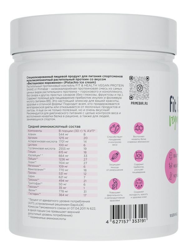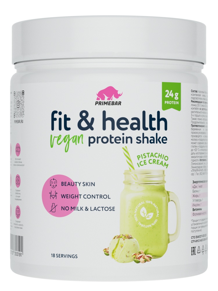 Растительный протеиновый коктейль Fit+Health VEGAN PROTEIN SHAKE от Primebar – низкокалорийная протеиновая смесь из самых ценных видов растительного протеина - изолята горохового и концентрата конопляного белка, без сахара и других простых сахаров (без глюкозы, фруктозы и пр.). Содержит полезный для пищеварения пребиотик инулин и фолиевую кислоту (витамин В9). Подходит всем, кто придерживается вегетарианской диеты или отказывается от молочных продуктов и лактозы.