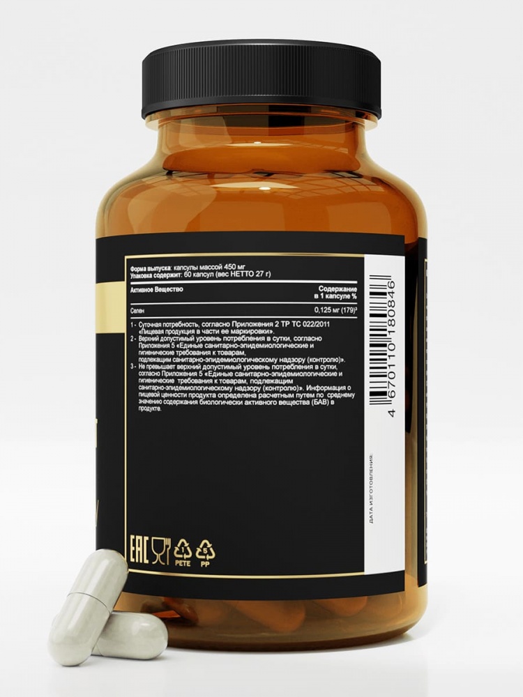 Состав: Микрокристаллическая целлюлоза (носитель/Е460i), селен, капсула (желатин, вода) – без диоксида титана.