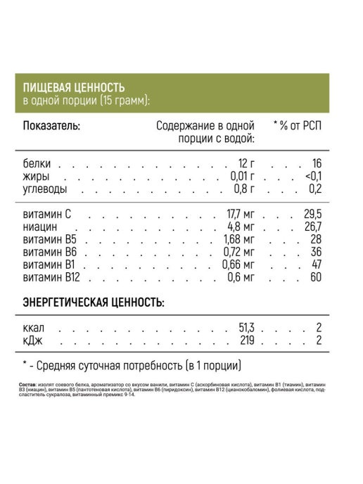 Способ приготовления: смешайте одну порцию продукта 15 г (1 мерная ложка) с 200-250 мл воды комнатной температуры в шейкере или блендере до однородной массы.
