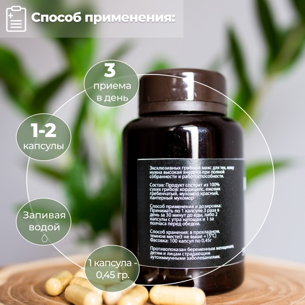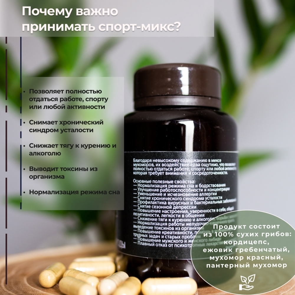 Благодаря невысокому содержанию в миксе мухоморов, их воздействие едва ощутимо, что позволяет полностью отдаться работе, спорту или любой активности, которая требует внимания и сосредоточенности.