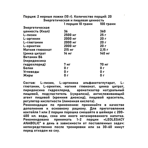 «LEOLEGACY ANABOLIC» обладает приятным вкусом, быстро усваивается в желудочно-кишечном тракте. Благодаря сбалансированному составу оказывает выраженное стимулирующее воздействие на выработку гормона роста, продлевая Вашу молодость, увеличивая спортивную результативность, повышая качество жизни. Не является самостоятельным пищевым продуктом, служит для дополнения рациона аминокислотами.