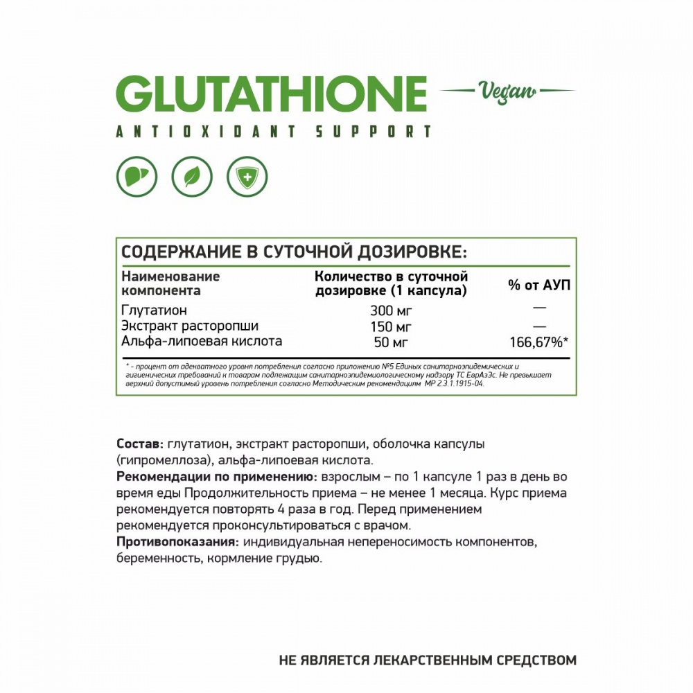 Глутатион – &8203;единственный из антиоксидантов, участвующий в трех из четырех линий антиоксидантной защиты клеток. В настоящее время глутатион рассматривается как главный внутриклеточный антиоксидант с мощным детоксикационным действием.
