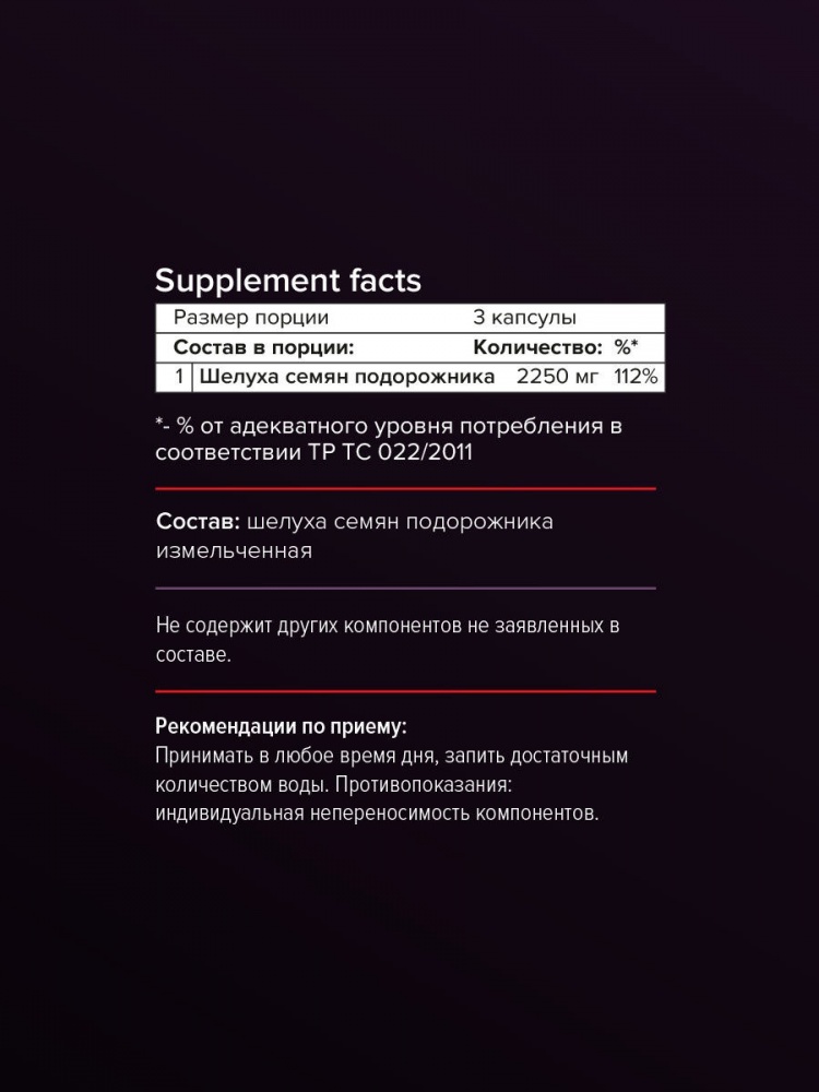 Пищевые волокна (Шелуха семян подорожника измельченная): 2250 мг