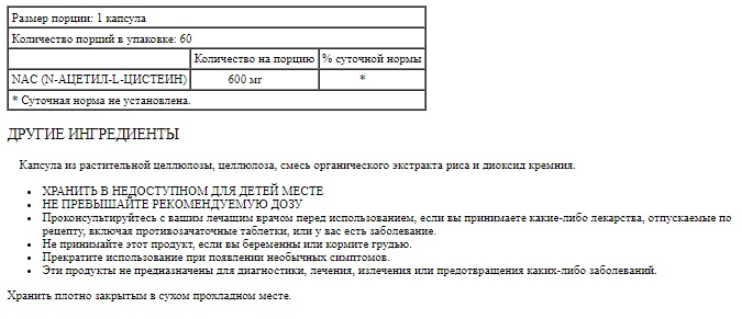 Рекомендации по применению: В качестве пищевой добавки по 1 капсуле 1–2 раза в день (от 600 до 1200 мг в день) во время еды или со стаканом воды. Добавки витамина С часто рекомендуются при приеме NAC.