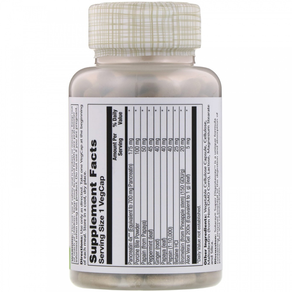 Solaray Super Digestaway — это уникальная формула, содержащая ферменты, необходимые для переваривания и усвоения белков, жиров и углеводов.