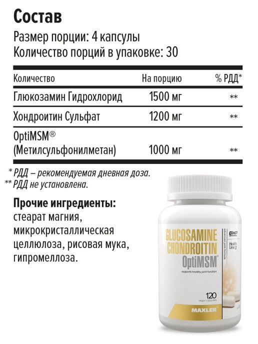 Glucosamine Chondroitin + OptiMSM от Maxler – это комплексная добавка, оказывающая эффективную поддержку костям, связкам и суставам. Продукт представляет собой эффективную комбинацию глюкозамина и хондроитина с высококачественной органической серой OptiMSM, которая обладает антисептическими и болеутоляющими свойствами. Сочетание именно этих трех компонентов зарекомендовало себя в качестве наилучшей поддержки опорно-двигательного аппарата. Оптимальные дозировки активных веществ делают комплекс незаменимым помощником связок и суставов в период повышенных физических нагрузок и восстановления после травм.