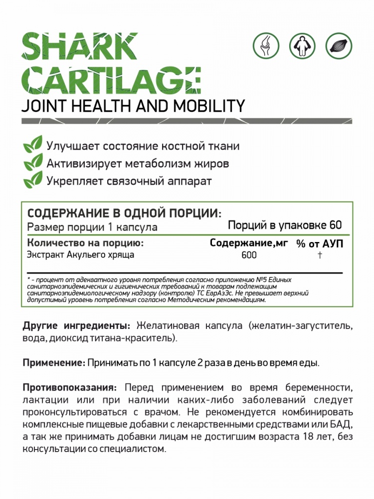Экстракт Акульего хряща: 600 мг