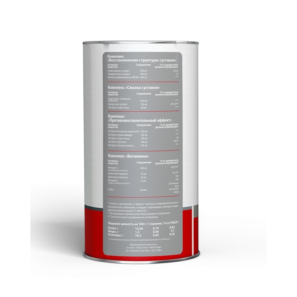 Комплекс "Восстановление структуры суставов" (таблетка): глюкозамина сульфат, хондроитина сульфат, метилсульфонилметан (МСМ), наполнители - микрокристаллическая целлюлоза, крахмал; разрыхлитель – тальк; антислеживающие агенты - стеариновая кислота, диоксид кремния.