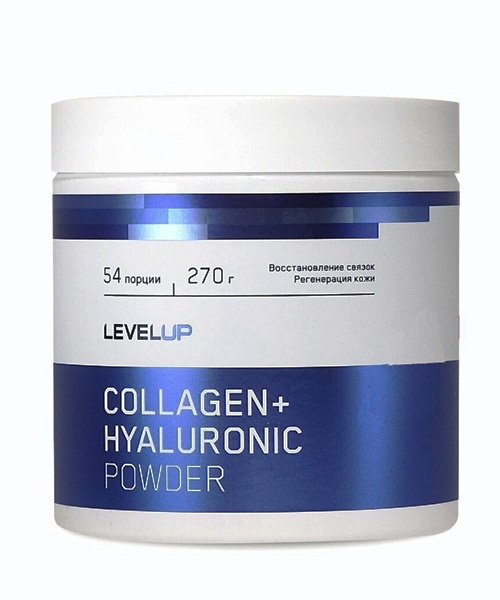 Collagen + Hyaluronic Powder от Level UP — комплекс на основе коллагена и гиалуроновой кислоты для поддержки здоровья суставов, связок, а также сохранения молодости и красоты кожи и волос.