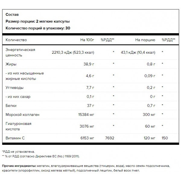 Уникальная формула Marine Collagen + Hyaluronic Acid от Maxler поможет Вам надолго сохранить красоту и молодость. В ее основе лежат высококачественный натуральный морской коллаген и гиалуроновая кислота в жидких формах, что значительно повышает их биодоступность. Софтгелевые капсулы окрашены натуральным хлорофиллом и обогащены витамином С, который улучшает усвоение коллагена. Комплекс не только эффективно восполняет нехватку коллагена и гиалуроновой кислоты, но и способствует выработке организмом их собственных запасов.