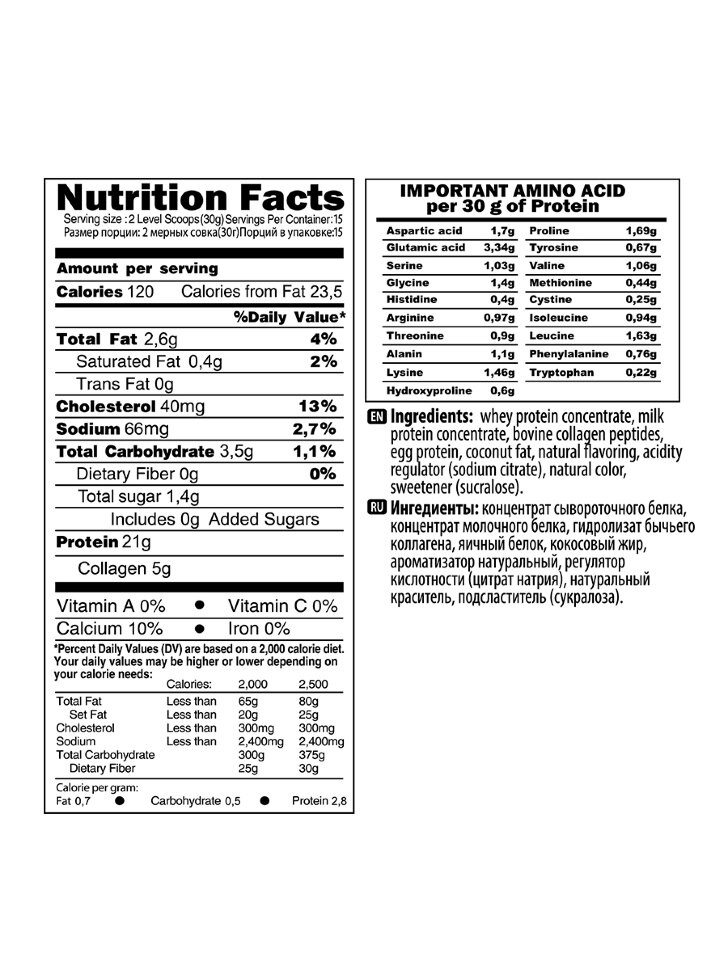 Не стоит забывать, что коллаген- это тоже сложный белок, составляющий основу соединительной ткани. Его дополнительное поступление в организм значительно улучшает состояние кожи, уменьшая количество морщин, снижает сухость кожи и даже уменьшает рельеф существующих шрамов и способствует их скорейшему заживлению. Более того, достаточное количество коллагена положительно влияет на здоровье волос, ногтей, а также суставов и связок. Пептиды гидролизованного коллагена- это коллаген с лучшей биологической усвояемостью (учёными доказана усвояемость до 90%), поэтому при их приёме не требуется дополнительный приём Витамина С. Вы просто делаете протеиновый коктейль привычным способом, наслаждаетесь вкусом и получаете максимум пользы при приёме!