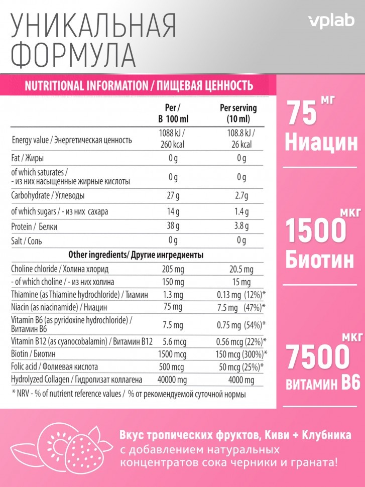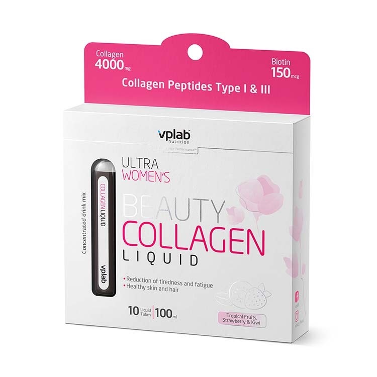 Жидкий коллаген красоты VPLAB Ultra Women's Beauty Collagen + Biotin Liquid содержит I и III типы коллагена, биотин, ниацин, фолиевую кислоту и другие витамины группы В. Этот сбалансированный комплекс специально разработан для женского организма, стимулирует клетки кожи вырабатывать больше коллагена и помогает поддерживать красоту изнутри.