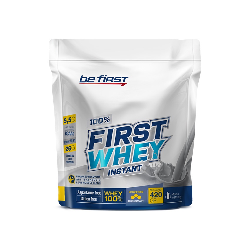 Be First идет другим путем. Вкус нашего протеина приятный, не приторный, если мешать его на воде. В то же время можно отметить ряд несомненных функциональных достоинств First Whey instant: