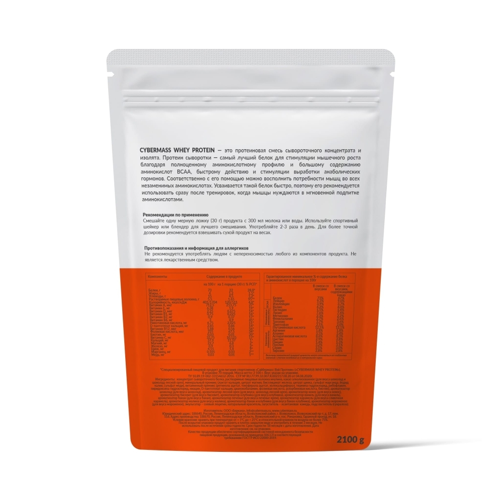 Whey Protein — сывороточный протеин от CYBERMASS. Это протеиновая смесь сывороточного концентрата и изолята. Протеин сыворотки – лучший в стимуляции мышечного роста благодаря полноценному аминокислотному профилю и большому содержанию ВСАА! Произведен из высококачественного европейского сырья, в частности, из сыворотки от компании Arla.