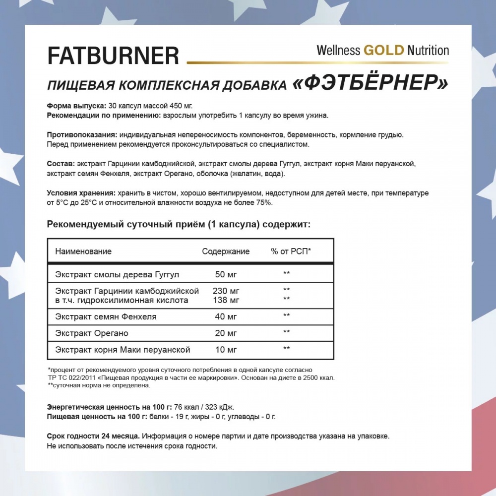 Как преобразовать жир в энергию? Добавляйте в свой рацион жиросжигатель Fat Burner от Wellness Gold Nutrition. Витаминный комплекс из 100% натуральных растительных экстрактов помогает обменным процессам в организме: экстракт орегано способствует нормализации обмена веществ, мака перуанская помогает в повышении энергии и выносливости организма, экстракт семян фенхеля содействует подавлению чувства голода, гарциния камбоджийская отвечает за контроль уровня сахара в крови, помогает повысить энергию и степень концентрации внимания. Если ваша цель - похудение, снижение подкожного жира, рост мышц и выраженный рельеф, подключайте к правильному питанию и тренировкам жиросжигатель для похудения.