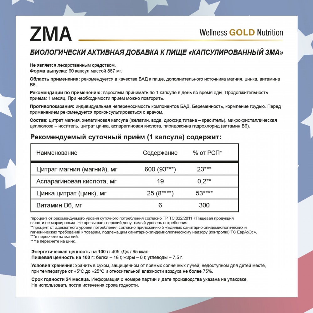 Тестобустер Wellness Gold Nutrition ZMA 60 капсул