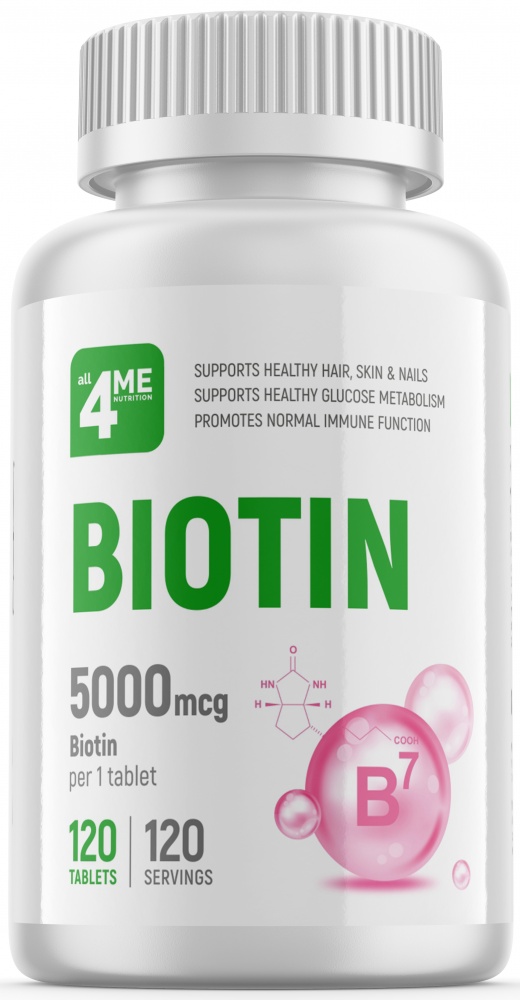 BIOTIN 5000 mcg от all4ME Nutrition - это источник витамина B7 (биотина) в таблетках с высокой дозировкой.