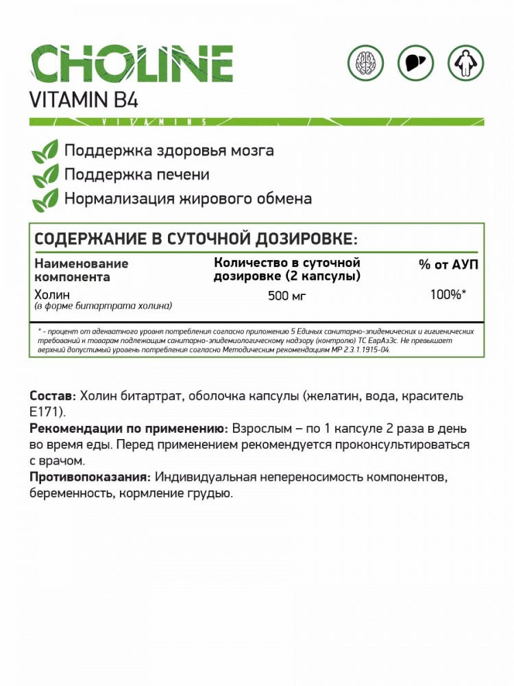 Холин (Витамин В4) является метаболическим предшественником важного нейромедиатора – ацетилхолина. Основным из свойств его является поддержание основных функций центральной нервной системы. Посредством холина происходит передача импульсов через клеточные мембраны и раннее развитие мозга.
