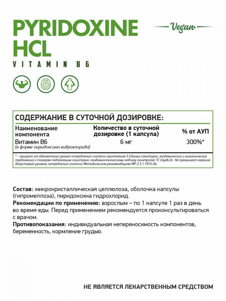 Витамины NaturalSupp Vitamin B6 PYRIDOXINE HCL 6 мг 60 капсул