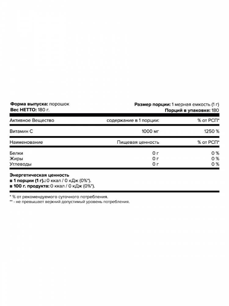 Пищевая ценность НА 1 ПОРЦИЮ г: витамин С 1000 мг.
