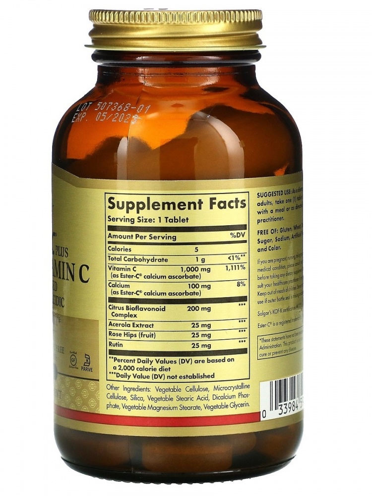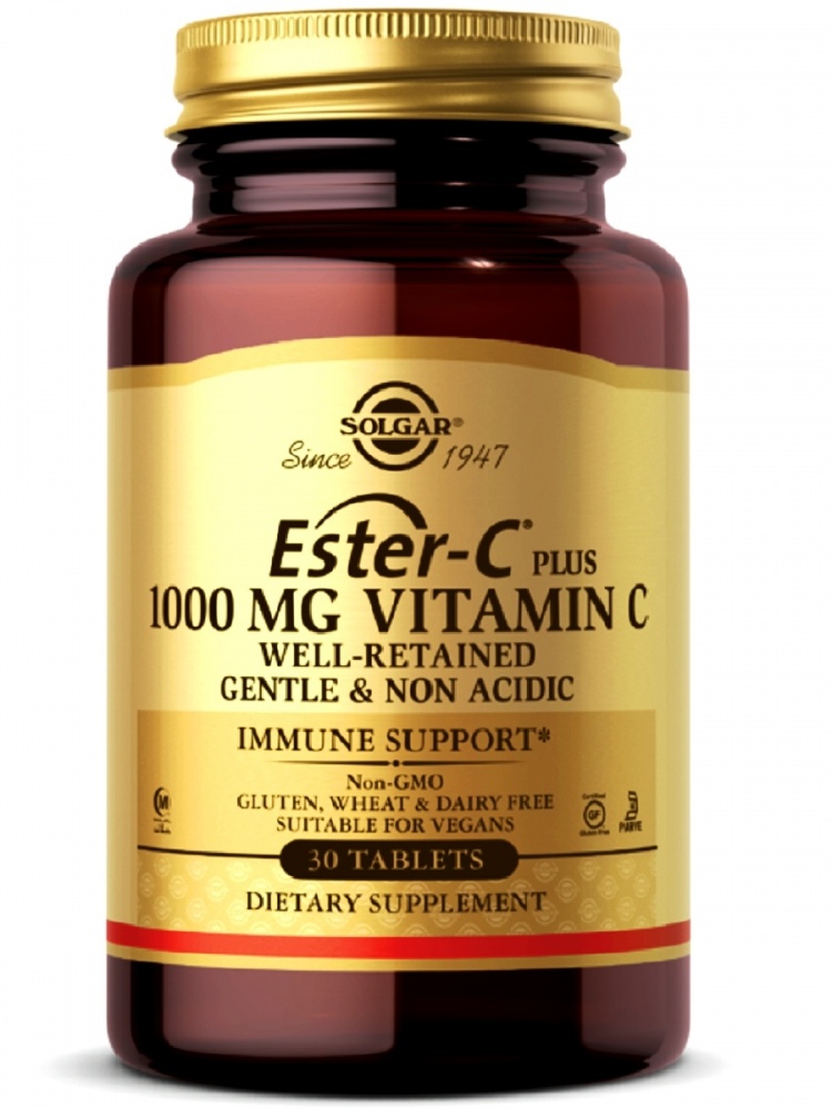Ester-C Plus — продукт, разработанный Solgar, обеспечивает запатентованным, рН-нейтральным (не кислотообразующим) витамином С, который не вреден для желудка. Метаболиты витамина С в Ester-C положительно влияют на сохранение витамина С в клетках, обеспечивая дополнительные преимущества. Применяется специальный процесс для формирования уникального метаболитного комплекса аскорбата кальция. Это комплекс полезен антиоксидантами, поддерживает иммунную систему, включает природные биофлавоноиды, ягод ацеролы и порошок плодов шиповника.