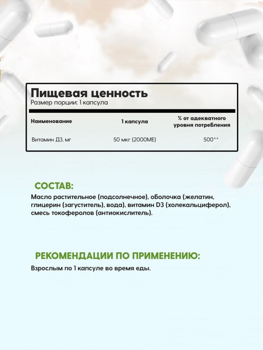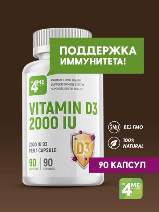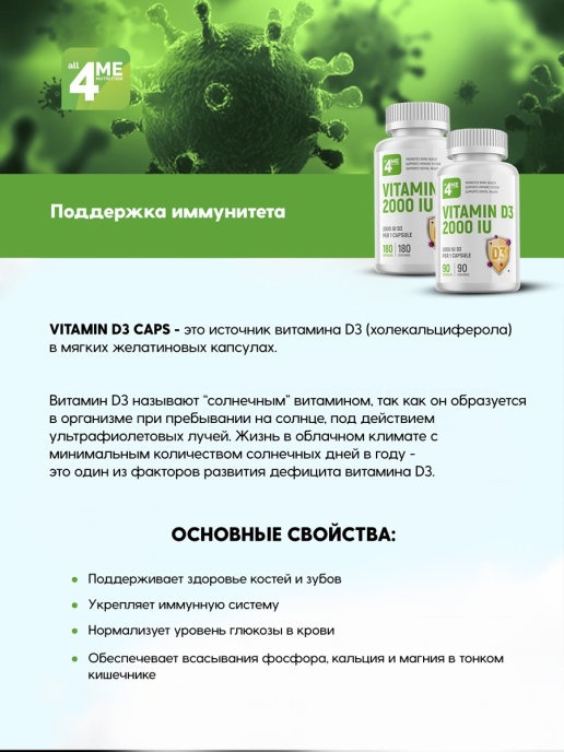 Vitamin D3 2000 от 4Me Nutrition - это источник витамина D3 в мягких желатиновых капсулах. Витамин D3 называют солнечным витамином, так как он образуется в организме при пребывании на солнце, под действием ультрафиолетовых лучей. Жизнь в облачном климате с минимальным количеством солнечных дней в году - это один из факторов развития дефицита витамина D3. Дефицит витамина D3 также связывают с высоким риском болезней сердца и сосудов, риском развития неврологических заболеваний и отдельных симптомов - ухудшения памяти, бессонницы.