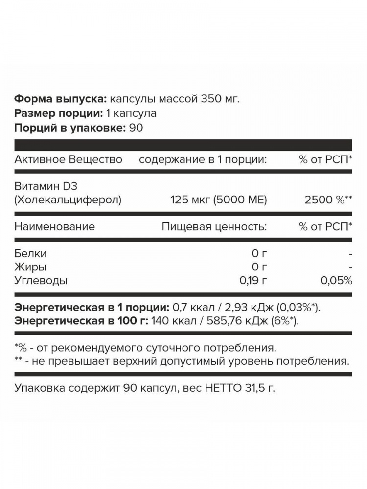 Витамин D3 (Холекальциферол): 125 мкг (5000 МЕ)