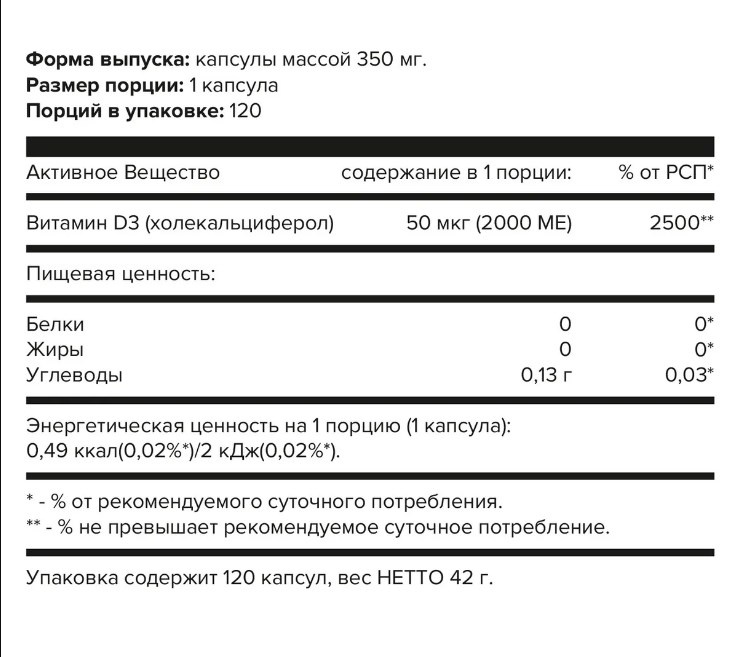 Состав: Микрокристаллическая целлюлоза , мальтодекстрин , витамин Д3 (холекальциферол), твердая капсула (желатин, краситель – диоксид титана Е171).