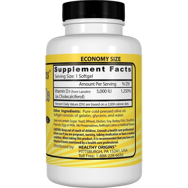 Healthy Origins Vitamin D3 5000 IU — ключевое питательное вещество, которое производится в легкоусвояемой форме гелевой капсулы. Витамин D3 синтезируется в организме из солнечного света и только небольшое количество можно получить из пищи. Зимний сезон и почти вся продукция, защищающая от солнца, подавляют способность организма производить надлежащий уровень витамина D. В результате, добавки с витамином D3 становятся еще более необходимыми для обеспечения организма необходимой концентрацией.