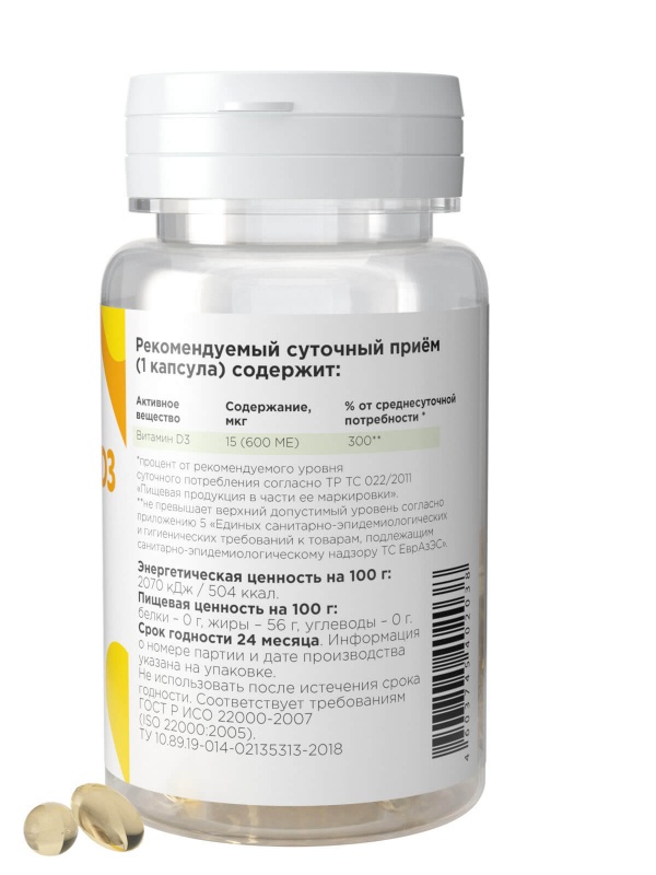 Витамин D способствует укреплению костной ткани, снижению риска развития остеопороза, повышению устойчивости организма к инфекциям, повышению в организме уровня серотонина - "гормона радости". В составе продукта "Витамин D3 600" витамин D представлен в виде холекальцеферола.