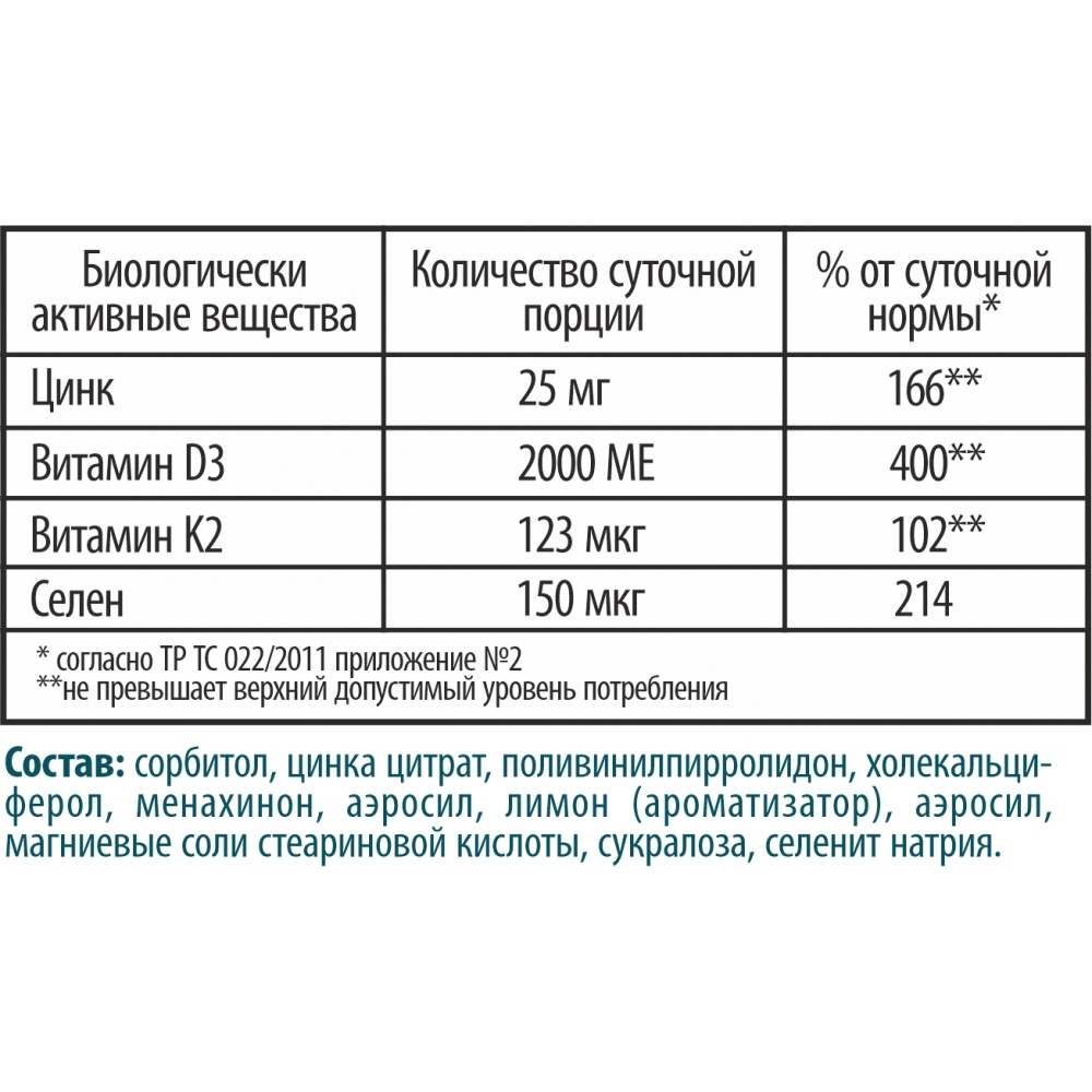 Этот комплекс витаминов обычно принимается для поддержания здоровья костей, иммунной системы и общего здоровья. K2 (витамин K2) и D3 (витамин D) необходимы для усвоения кальция, что в свою очередь помогает поддерживать здоровье костей и зубов. Цинк и селен оба поддерживают иммунную систему и имеют антиоксидантные свойства, что помогает защитить клетки от повреждений. Таким образом, этот комплекс витаминов может быть полезен для поддержания общего здоровья и укрепления иммунитета.