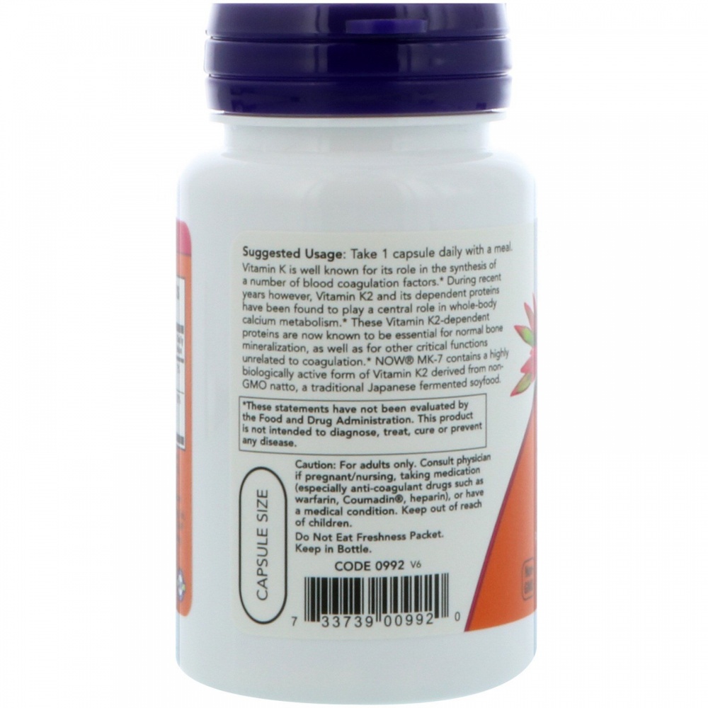 Известно, что витамин К играет роль в синтезе факторов свертываемости крови. Однако, за последние годы было обнаружено, что витамин К2 и зависящие от него протеины играют важнейшую роль в метаболизме кальция в организме. Это зависящие от витамина К2 протеины необходимы для нормальной минерализации костей, а также для других жизненно важных функций, не связанных с коагуляцией. NOW MK-7 содержит чрезвычайно биологически активную форму витамина К2, полученную из не содержащего ГМО соевого сыра, японского традиционного ферментированного продукта.