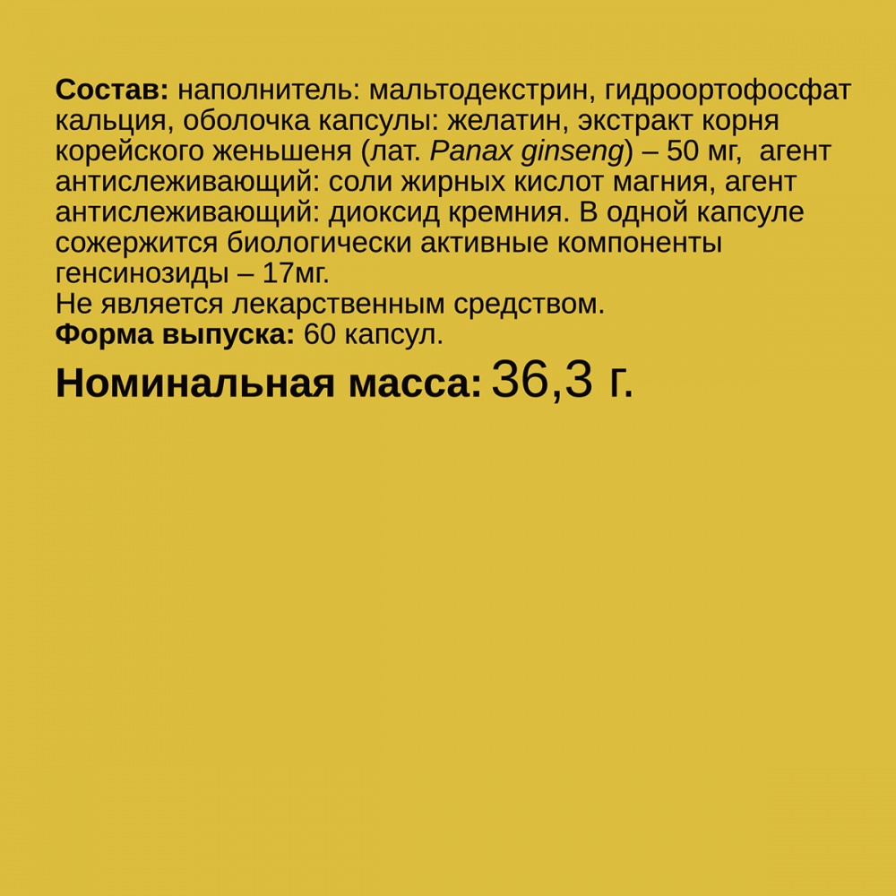 Состав: наполнитель: мальтодекстрин, гидроортофосфат кальция, оболочка капсулы: желатин, экстракт корня кореи&774;ского женьшеня (лат. Panax ginseng) – 50 мг, агент антислеживающии&774;: соли жирных кислот магния, агент антислеживающии&774;: диоксид кремния. В однои&774; капсуле сожержится биологически активные компоненты генсинозиды – 17мг.