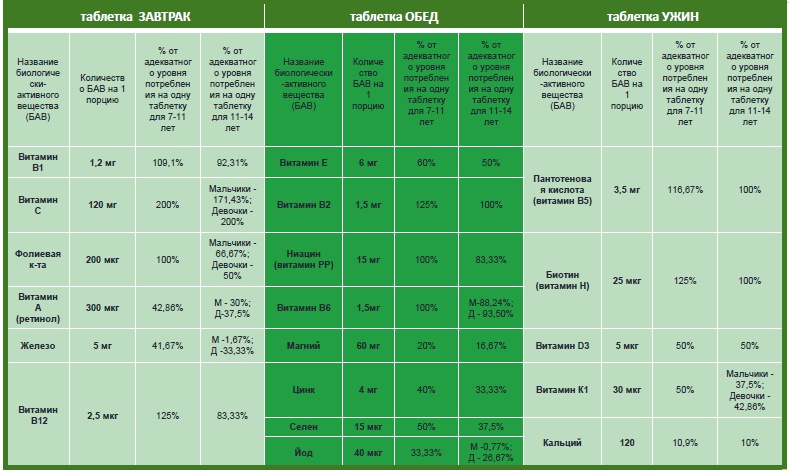 Основные витамины (В1, В2, В5, В6, Вс, В12, РР, Н, С, А, D3, Е, К1); основные биогенные минеральные вещества (кальций, магний, железо, цинк, йод, селен), которые необходимы для обеспечения нормального роста и развития детей и подростков, а также для поддержания обменных процессов в организме на оптимальном уровне.