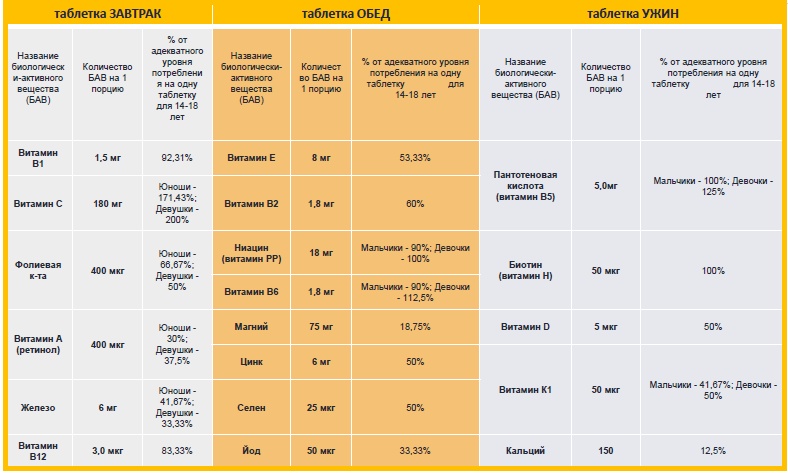 Детям 14-18 лет разжевать и запить небольшим количеством воды по 1 таблетке "Завтрак" во время завтрака, по 1 таблетке "Обед" во время обеда и по 1 таблетке "Ужин" во время ужина. Принимать на фоне физических и психоэмоциональных нагрузок на организм. Продолжительность приема - 1 месяц. При необходимости прием можно повторить.