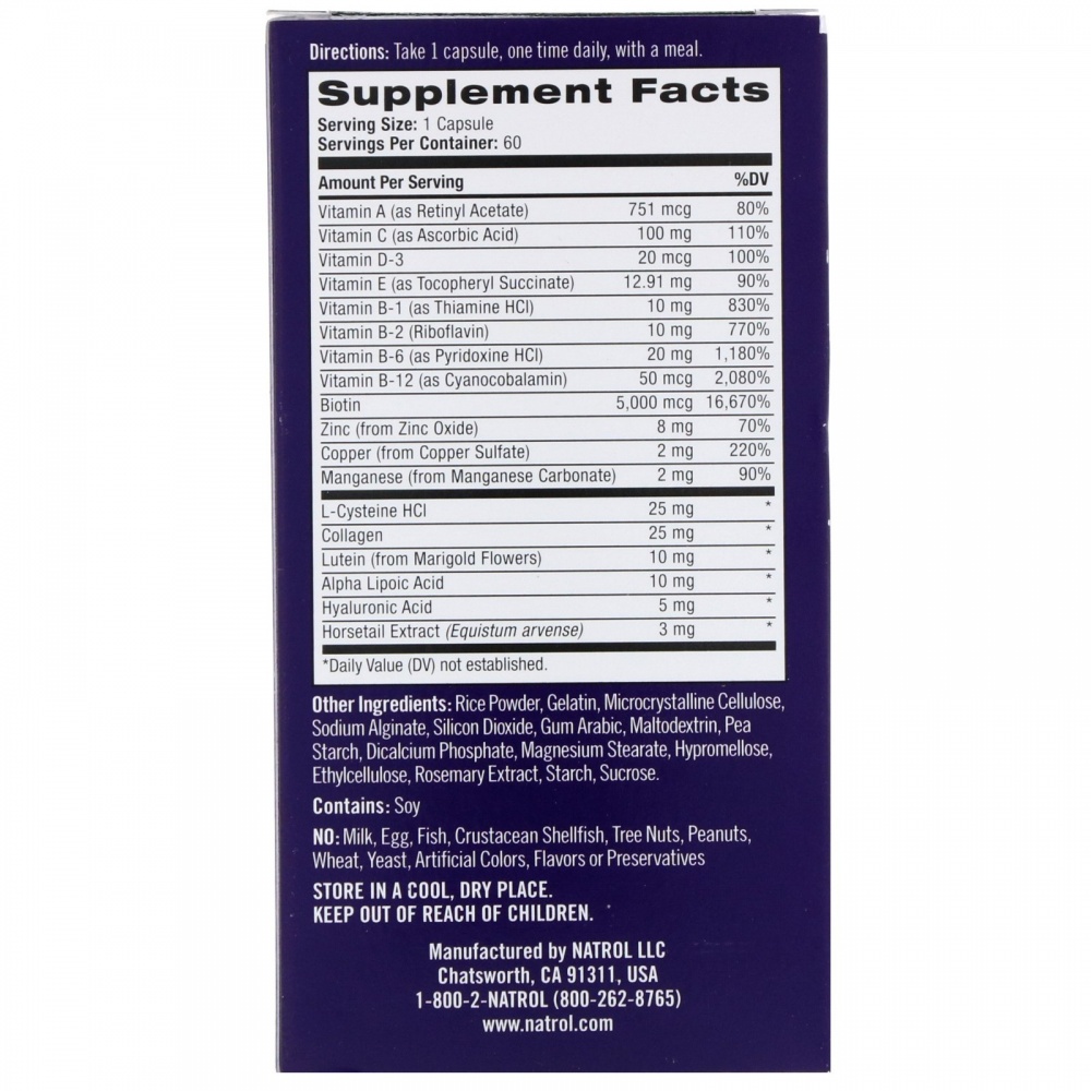 В отличие от множества других продуктов для волос, кожи и ногтей, требующих приема до 3 пилюль за раз, Natrol Skin, Hair and Nails содержит мощное сочетание полезных ингредиентов для вашей красоты всего в одной капсуле в день.