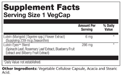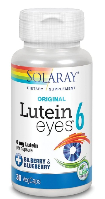 Solaray Lutein Eyes 6 полученный из цветов календулы, содержит природный зеаксантин. Зеаксантин и лютеин, встречающиеся в природе вместе и обычно содержащиеся в ярко окрашенных фруктах и &8203;&8203;овощах, являются сильными антиоксидантами и каротиноидами, которые в высоких концентрациях обнаруживаются в человеческом глазу. Хотя лютеин в основном используется для поддержания здоровья глаз и желтого пятна, также известно, что он жизненно важен для здоровья кожи и сердечно-сосудистой системы.